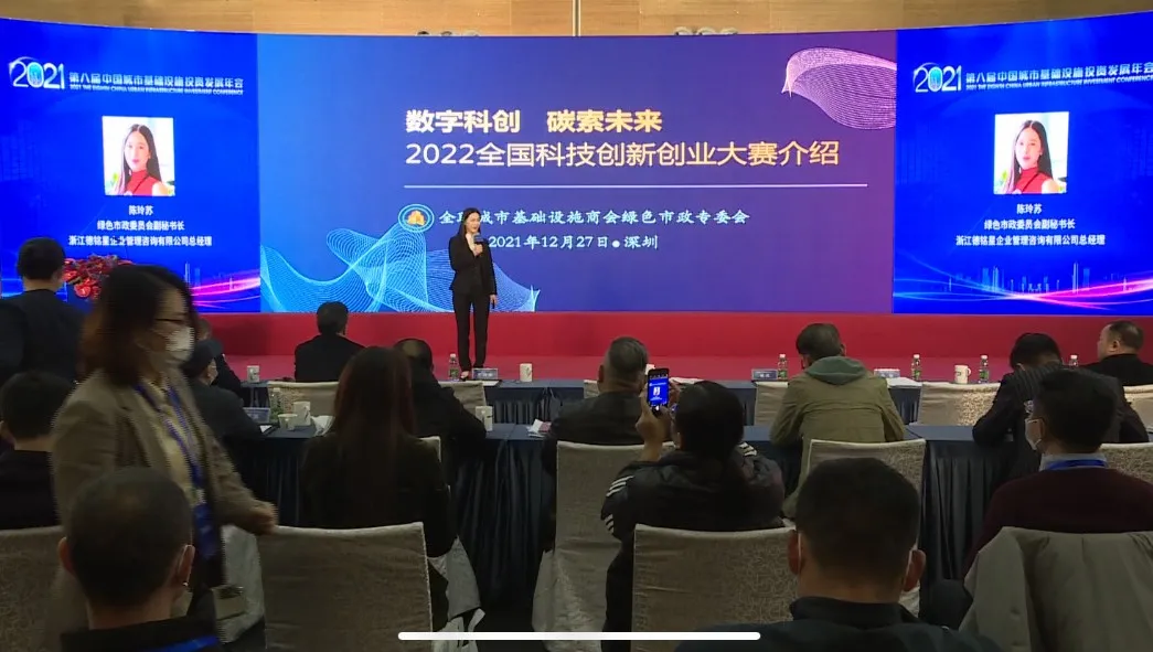 商会绿色市政委员会副秘书长、浙江德铭星企业管理咨询有限公司总经理陈玲苏重点介绍商会绿色市政委员会的工作情况和规划设想,并就2022全国科技创新创业大赛的宗旨、内容和赛事安排等方面进行分享。
